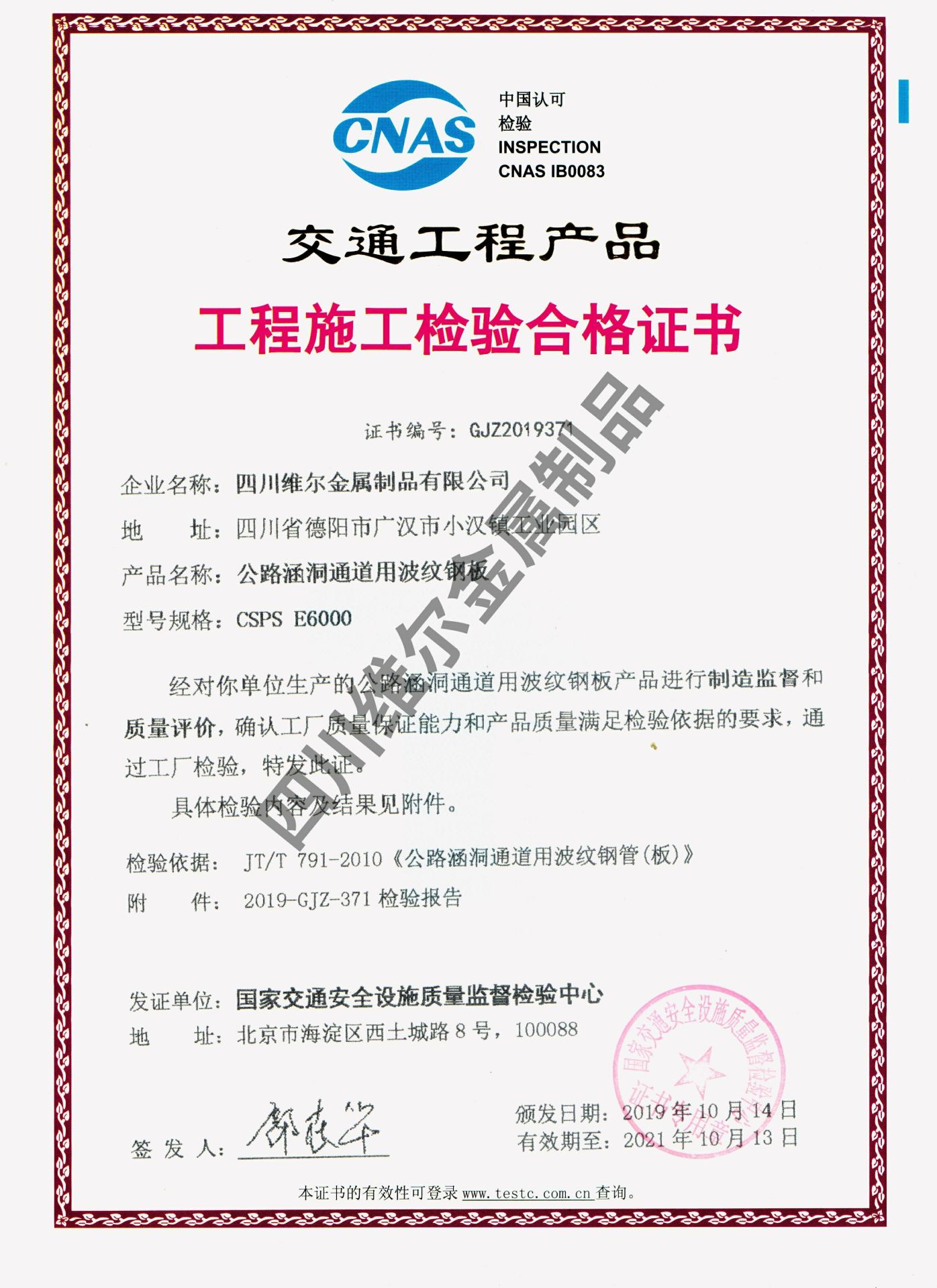 工程施工检验合格证书